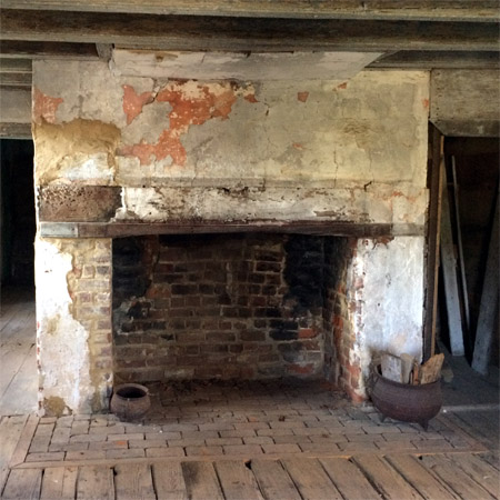 Around 1800, a large framed addition was built on the south side of the original building. The addition is of the more typical braced-frame construction. These walls were built for exterior weatherboard sheathing and interior lath and plaster finish. The original chimney, which appears to have been rebuilt when this addition was constructed, has a fireplace with a segmental brick arch framed by a simple wooden mantelpiece. A similar fireplace in the central