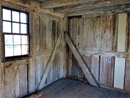 The walls are comprised of vertical planks, 2½ inches thick and ranging from six to twelve inches wide, set side-by-side with chamfered battens. The planks, tenoned to fit channels in the sills, braces and plates, are planed and exposed on the interior.