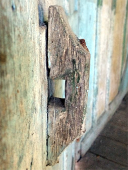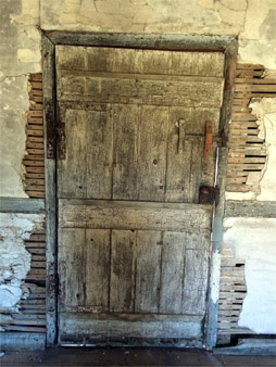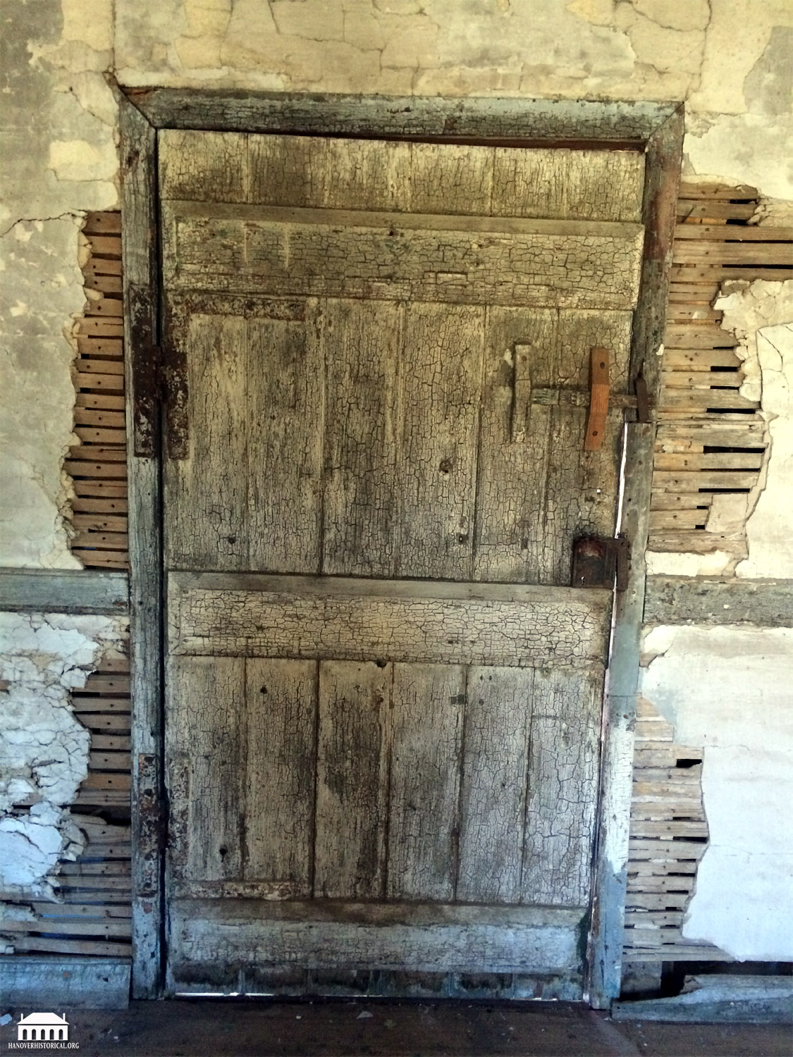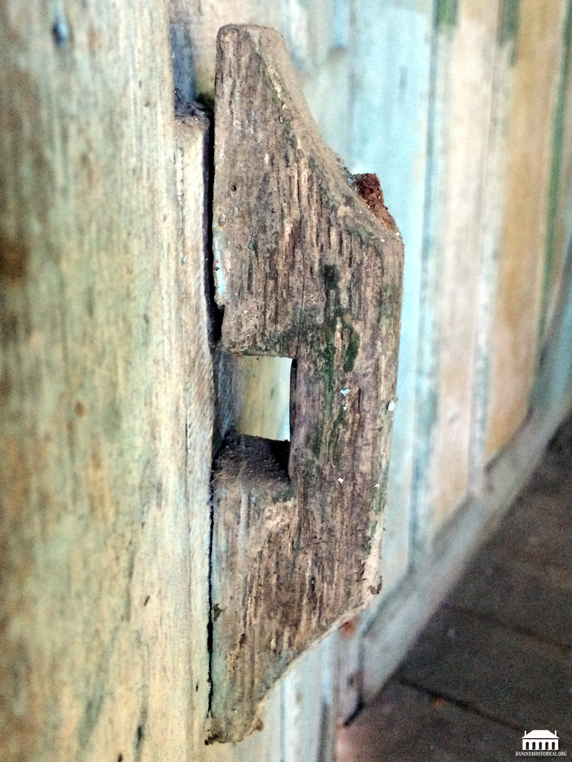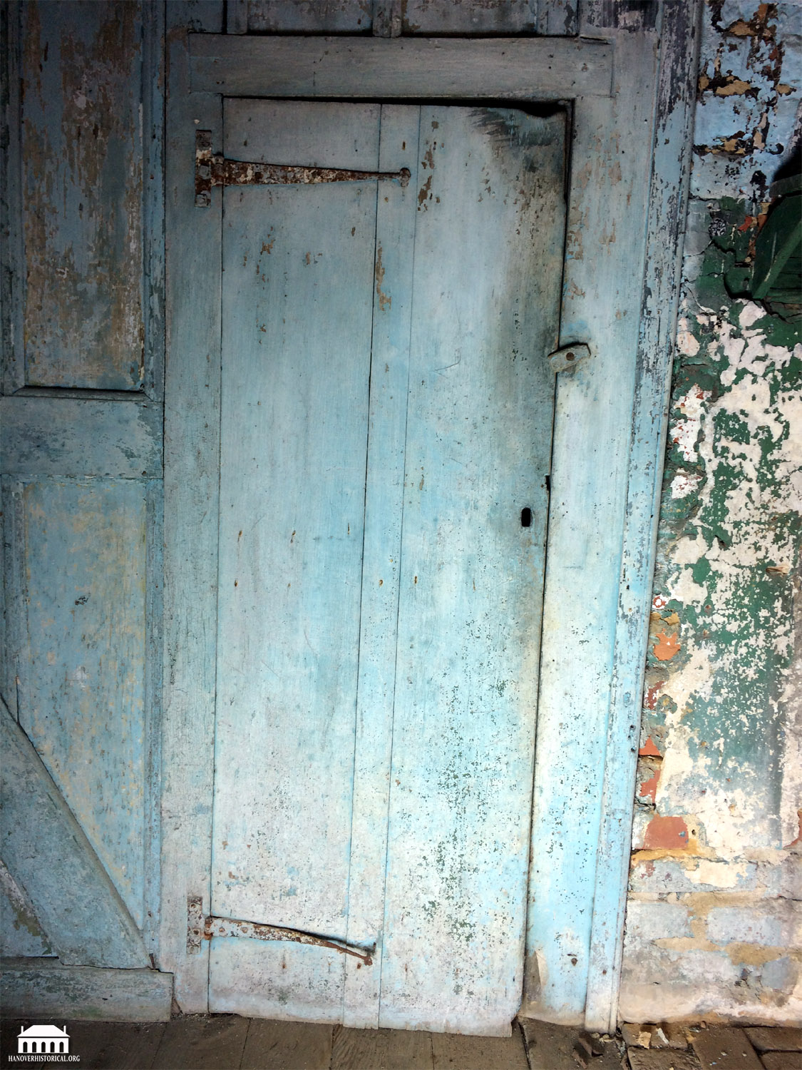 Hardware in the building is a mixture of wrought-iron strap hinges and surface-mounted H-L hinges. Two wooden box locks and several wooden latches are in place on the batten doors, while several iron rim locks with porcelain knobs, typical of mid-19th