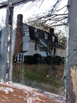 Prospect Hill, as seen in a reflection on Pine Slash's window. |