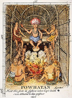 The first European depiction of Powhatan, from John Smith's Map of Virginia, published in 1612 |